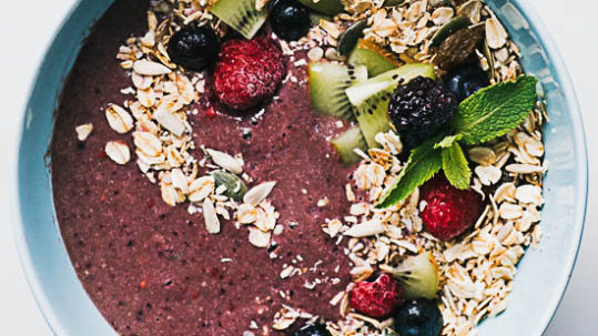 This smoothie bowl is coloured purple with berries but also contains some good greens to get going with the vegetables first thing.